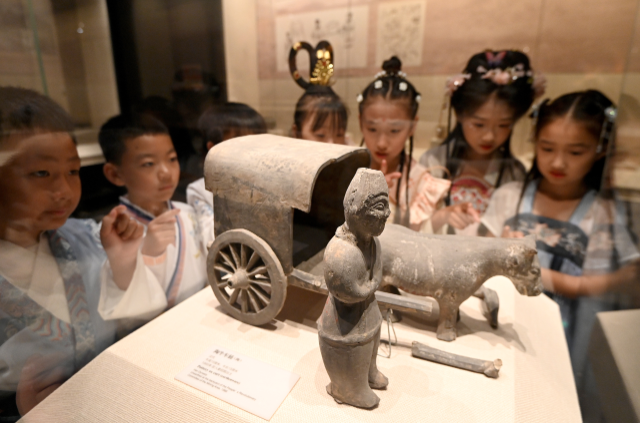 學(xué)生參觀漢代陶牛車俑。通訊員 郝群英 攝