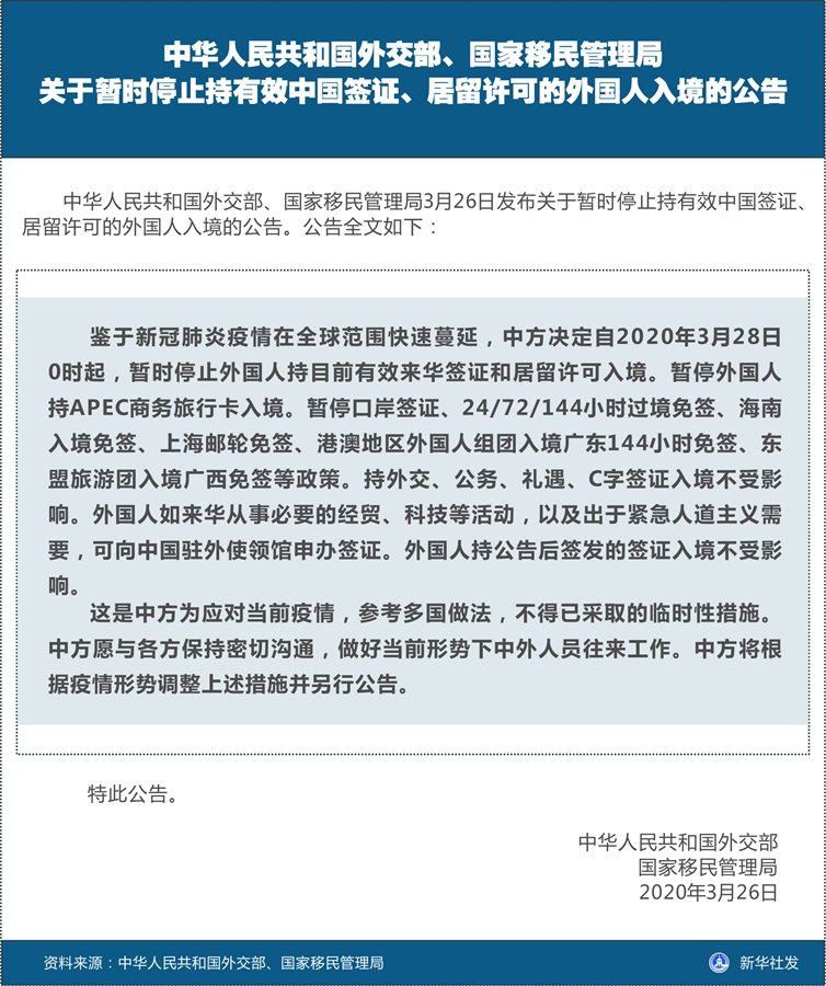 鑒于新冠肺炎疫情在全球范圍快速蔓延,中方決定自2020年3月28日0時起,暫時停止外國人持目前有效來華簽證和居留許可入境。暫停外國人持APEC商務旅行卡入境。暫??诎逗炞C、24/72/144小時過境免簽、海南入境免簽、上海郵輪免簽、港澳地區(qū)外國人組團入境廣東144小時免簽、東盟旅游團入境廣西免簽等政策。持外交、公務、禮遇、C字簽證入境不受影響。外國人如來華從事必要的經貿、科技等活動,以及出于緊急人道主義需要,可向中國駐外使領館申辦簽證。外國人持公告后簽發(fā)的簽證入境不受影響。