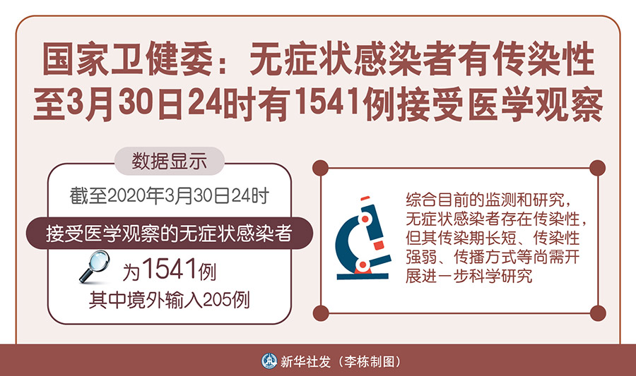 新華社北京3月31日電(記者 王秉陽)國家衛(wèi)健委31日在官網(wǎng)發(fā)布《關(guān)于新型冠狀病毒無癥狀感染者的防控工作答問》,對近來網(wǎng)民熱議的無癥狀感染者相關(guān)問題進(jìn)行回答。數(shù)據(jù)顯示,截至2020年3月30日24時,接受醫(yī)學(xué)觀察的無癥狀感染者為1541例,其中境外輸入205例。