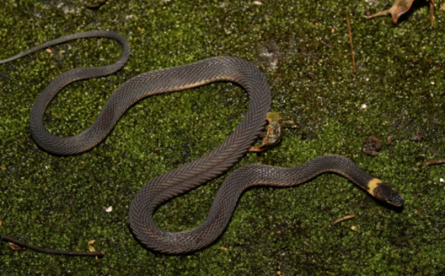 2022年10月14日,莫小陽團隊成員李輝、朱樂強等在懷化市通道縣進行生物多樣性資源調(diào)查,突然,一條被汽車壓扁的蛇吸引了他們的注意力。“它和我們以往看到的脊蛇有些不一樣,頸部有乳黃色的環(huán)紋。”對野生動物非常熱愛的李輝敏銳地意識到“這條蛇不簡單”。隊員們將它帶回了實驗室,經(jīng)過形態(tài)學(xué)分析以及分子檢測,發(fā)現(xiàn)該種與已知的脊蛇屬其他物種均有差異。