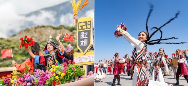 左圖:2025年8月21日上午,彩車上的演員通過西藏拉薩市布達(dá)拉宮廣場時(shí)向人群揮手,熱烈慶祝西藏自治區(qū)成立60周年。右圖:2025年9月23日下午,群眾載歌載舞,喜迎新疆維吾爾自治區(qū)成立70周年。新華社記者 丁增尼達(dá) 畢曉洋 攝