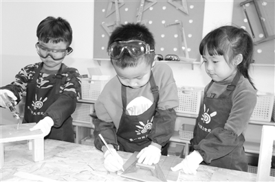 包頭鐵路第一幼兒園的木工坊,是大班孩子社會活動的區(qū)域。在保證安全的情況下,教師支持孩子按自己的想法完成工木作品,鼓勵并給予一定的指導。孩子們在操作過程中,不斷發(fā)現(xiàn)并解決問題,在完成作品的同時提高了專注力、學習力和思考能力。王霞 攝