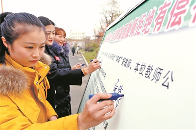 11月27日,江蘇東??h實驗小學(xué)教師在拒絕有償補(bǔ)課承諾書展板上簽名。當(dāng)日,該縣各中小學(xué)和幼兒園舉行教師拒絕有償補(bǔ)課公開承諾簽名活動,全縣1.3萬余名在職教師參與。張開虎 許增文 攝