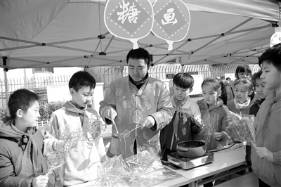 圖為學(xué)生在“糖畫”傳人手工藝師程陽指導(dǎo)下學(xué)習(xí)“糖畫”的制作技能。