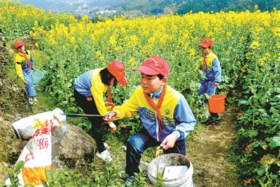 3月16日,江西省婺源縣溪頭鄉(xiāng)龍尾小學(xué)學(xué)生在收撿垃圾。正值婺源縣油菜花開旺季,前來賞花踏春的游客絡(luò)繹不絕。該校五年級學(xué)生利用雙休日時間,來到江嶺萬畝油菜花海,收撿游客留下的生活垃圾,倡導(dǎo)綠色環(huán)保、文明出游。卓忠偉 汪海蛟 攝