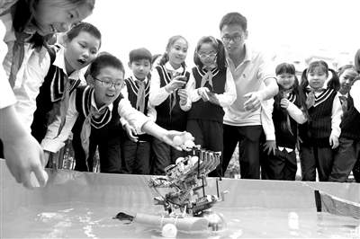 圖為該校學(xué)生在了解爬坡機(jī)器人的工作原理。新華社記者 劉軍喜 攝