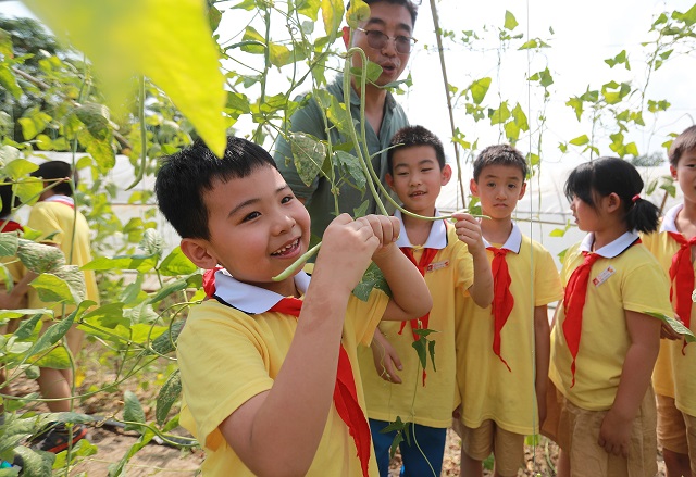 6月10日,山東省淄博市張店區(qū)西六路小學(xué)學(xué)生走進(jìn)淄博市植物園勞動(dòng)實(shí)踐基地,通過近距離觀察植物、參加勞動(dòng),了解二十四節(jié)氣的相關(guān)知識(shí)。本報(bào)記者 張學(xué)軍 攝
