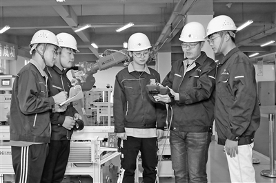 圖為遼寧機(jī)電職業(yè)技術(shù)學(xué)院工業(yè)機(jī)器人技術(shù)專業(yè)教師夏金偉指導(dǎo)學(xué)生進(jìn)行工業(yè)機(jī)器人現(xiàn)場編程。