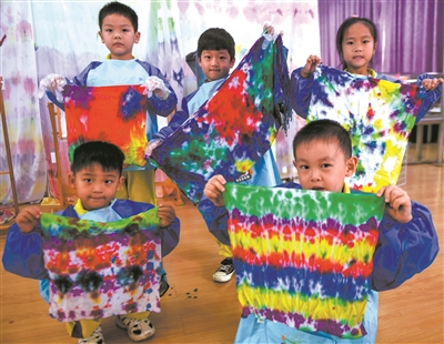 10月23日,孩子們展示自己的扎染作品。今年以來,浙江省長興縣夾浦鎮(zhèn)中心幼兒園依托當(dāng)?shù)貍鹘y(tǒng)布藝文化基礎(chǔ)開設(shè)“七彩課堂”,引進(jìn)布藝、扎染等傳統(tǒng)工藝課程,讓孩子們感受民間工藝的魅力。新華社記者 徐昱 攝
