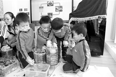 教師把撕碎的廚余垃圾放進(jìn)塑料桶,然后放入一層營(yíng)養(yǎng)土,問(wèn):“現(xiàn)在桶里有一層垃圾和一層營(yíng)養(yǎng)土,這兩層有什么不一樣?為什么這樣放?”