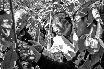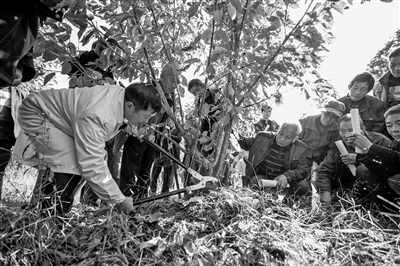 在貴州省畢節(jié)市大方縣對(duì)江鎮(zhèn)營(yíng)興村,農(nóng)技人員正在教授群眾果樹管理知識(shí)。對(duì)江鎮(zhèn)屬于高原山區(qū)地形,耕地面積5.7萬(wàn)畝,土地碎塊化嚴(yán)重。近年來(lái),當(dāng)?shù)卣谵r(nóng)業(yè)產(chǎn)業(yè)結(jié)構(gòu)調(diào)整工作中,大力發(fā)展適宜當(dāng)?shù)厣L(zhǎng)的櫻桃、李子、梨、桃等數(shù)十種經(jīng)果林近2萬(wàn)畝。為了讓群眾能夠科學(xué)掌握果樹的種植、修枝、施肥等技術(shù),對(duì)江鎮(zhèn)利用農(nóng)閑時(shí)節(jié),邀請(qǐng)畢節(jié)職業(yè)技術(shù)學(xué)院的農(nóng)技專家走進(jìn)田間地頭,手把手教授群眾掌握科學(xué)的果樹管理技術(shù),為來(lái)年果樹豐收打基礎(chǔ)。羅大富 攝