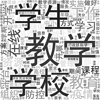 “停課不停學”如何落地?課題組搜集了全國26個省份和144個地級市的教育行政部門發(fā)布的“停課不停學”相關通知,將這些文件進行文本合并、分詞處理和詞頻統(tǒng)計,將相近詞進行合并處理,形成了“停課不停學”相關文件詞云圖(見文尾),從數(shù)據(jù)看,通知中的重點詞匯包括:在線學習資源、學習平臺、教學方案、管理方式等,文件強調(diào)要做好疫情防控、教學組織和實施,并為線上教學提供相關的技術支持。