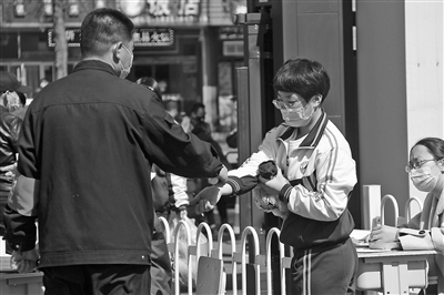 學(xué)生在保安的指揮下有序進(jìn)入校門并接受體溫檢測(cè)。4月23日,河北省唐山市樂(lè)亭縣第一中學(xué)高三學(xué)生重返分別了3個(gè)多月的校園。據(jù)了解,按照河北省教育廳發(fā)布的開(kāi)學(xué)通知精神,學(xué)校根據(jù)實(shí)際制定開(kāi)學(xué)工作方案,備足疫情防控物資,對(duì)學(xué)校環(huán)境衛(wèi)生進(jìn)行了徹底整治,并通過(guò)了當(dāng)?shù)匦l(wèi)健、市場(chǎng)監(jiān)管等部門的聯(lián)合核驗(yàn)。目前,復(fù)課教學(xué)已進(jìn)入正常狀態(tài),800多名學(xué)子正以飽滿的狀態(tài)全力備考。