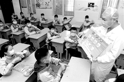 4月26日,安徽省阜陽市蓮池小學(xué)疫情防控指導(dǎo)員向小學(xué)生們講授七步洗手法。當(dāng)日,阜陽市小學(xué)四、五、六年級以及初二和高二年級的學(xué)生正式開學(xué)復(fù)課。各校通過開展“科學(xué)防疫安全防護(hù)”主題班會,向?qū)W生們講解正確佩戴口罩等知識,引導(dǎo)學(xué)生做好個(gè)人防護(hù)。王彪 攝