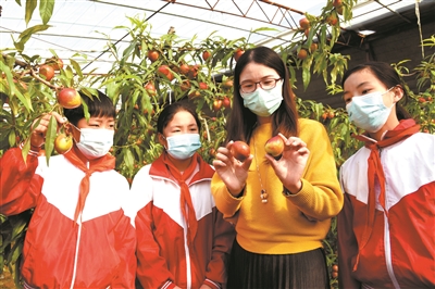 4月28日,江蘇省連云港市東??h桃林鎮(zhèn)第二中心小學(xué)教師給學(xué)生介紹油桃的生長特性。該校開設(shè)“校園農(nóng)場”,為學(xué)生搭建勞動實踐、種植探究、親近自然的平臺,讓學(xué)生在體驗農(nóng)耕文化的同時,養(yǎng)成勤儉節(jié)約、熱愛勞動的良好習(xí)慣。張正友 攝