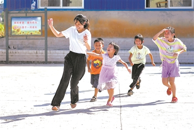 8月5日,在湖南省花垣縣麻栗場(chǎng)鎮(zhèn)溜豆村小學(xué),大學(xué)生與孩子們一起做游戲。湖南女子學(xué)院和長沙航空職業(yè)技術(shù)學(xué)院的大學(xué)生5年來堅(jiān)持到該村開展暑期支教活動(dòng),讓孩子們快樂過暑期。龍恩澤 攝