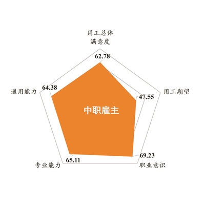 從各分項(xiàng)維度得分看,總體上調(diào)查對(duì)象對(duì)中職教育的期望分值普遍偏低,而滿意度分值相對(duì)較高。在學(xué)生調(diào)查中,分值最高的是教育質(zhì)量感知,其次是就學(xué)總體滿意度,提高幅度最大的是公平感知,提高了6.40分。雇主調(diào)查中,分值前三依次是中職畢業(yè)生職業(yè)意識(shí)、專業(yè)能力和通用能力的滿意度。教師調(diào)查中,分值最高的是學(xué)校管理,其次是政府保障。校長(zhǎng)調(diào)查中,分值最高的是工作成就與勝任力,其次是工作績(jī)效,分值最低的是工作負(fù)擔(dān)適度感。