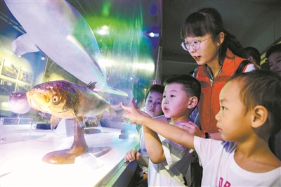 8月9日,大學(xué)生志愿者帶著小朋友觀看長(zhǎng)江魚類標(biāo)本。當(dāng)日,江蘇大學(xué)京江學(xué)院志愿者與鎮(zhèn)江市征潤(rùn)州社區(qū)、長(zhǎng)江村的小朋友共同走進(jìn)新金江漁文化館,參觀中華鱘、白鰭豚、江豚等長(zhǎng)江魚類標(biāo)本,了解長(zhǎng)江漁業(yè)資源及捕魚歷史等知識(shí),增強(qiáng)孩子們保護(hù)長(zhǎng)江生態(tài)環(huán)境的意識(shí)。