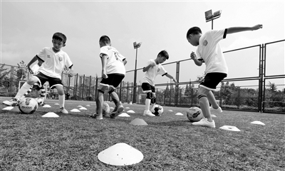 8月5日,參加“體驗趣味足球·樂享健康暑期”主題活動的孩子們在蘇州市運河體育公園體驗帶球過障礙。