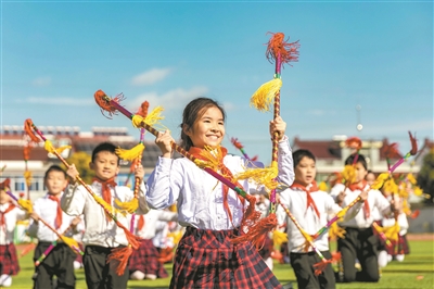 11月3日,江蘇省海安市城東鎮(zhèn)西場小學學生在操場上練習“健康連廂”。該校將非物質(zhì)文化遺產(chǎn)“打連廂”引進校園,聘請非遺傳承人編排“健康連廂”,將時尚的音樂、舞蹈元素融入傳統(tǒng)“打連廂”之中,在全校師生中推廣,成為校園一道獨特而亮麗的風景線。