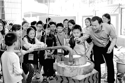 走進(jìn)延奎實(shí)驗(yàn)小學(xué),閩南元素被滲透到學(xué)校各個(gè)角落,學(xué)校像是一個(gè)鮮活的博物館。這里有“咱的厝”“咱的埕”“咱的園”三個(gè)板塊。以“咱的埕”為例,這是一個(gè)在古樹綠葉掩映之下的小院子,墻上掛著閩南童玩的器具,孩子們可以在院子里滾鐵環(huán)、打陀螺、跳房子。這里有石磨,學(xué)生可以自己動(dòng)手磨豆?jié){,并由食堂幫忙把豆?jié){煮熟。下課前,孩子們就能品嘗到自己的勞動(dòng)成果。除了在環(huán)境上打造閩南特色,在學(xué)校的校本課程、文體活動(dòng)中,更是處處體現(xiàn)出閩南特色。學(xué)校把歌仔戲、答嘴鼓等閩南文藝項(xiàng)目納入校本課程,讓學(xué)生全面了解閩南的文化與習(xí)俗?,F(xiàn)在,學(xué)閩南話、唱閩南歌,已經(jīng)成為學(xué)校的常項(xiàng)活動(dòng)。2016年4月,學(xué)校被中央人民廣播電臺(tái)授牌為“閩南語主持人水平測(cè)試教研推廣點(diǎn)”。