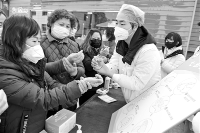 1月6日,在江蘇省鎮(zhèn)江市新金江社區(qū),江蘇大學(xué)醫(yī)學(xué)院志愿者在指導(dǎo)居民學(xué)習(xí)“七步洗手法”。江蘇大學(xué)醫(yī)學(xué)院志愿者來到鎮(zhèn)江市和平路街道新金江社區(qū),開展“疫情防控知識伴我行”活動,向中老年居民普及新的疫情防控優(yōu)化條例,宣講日常的健康防疫知識及防護技能,增強市民的健康防護意識。石玉成 攝