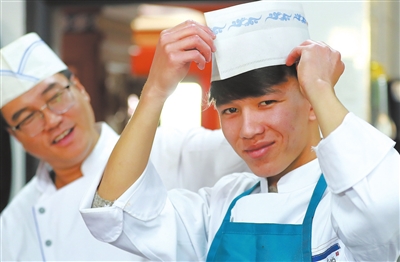 和碩縣高級中學烹飪專業(yè)學生艾力·艾山(右)被當?shù)匾患抑蛷d錄用,受到餐廳主管的好評。