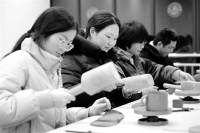 2月24日晚,在長興縣總工會工人文化宮,企業(yè)職工在非遺傳承人的指導下學習非遺紫砂壺制作。 譚云俸 攝