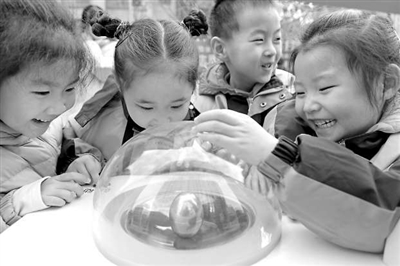 陜西省渭南市臨渭區(qū)蘇園豐景幼兒園,孩子們體驗(yàn)科普大篷車項(xiàng)目“旋轉(zhuǎn)的銀蛋”。通訊員 崔正博 攝