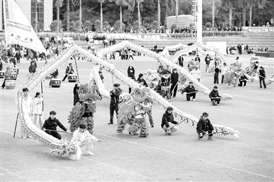泉州輕工職業(yè)學院第九屆運動習慣比試大會彩排現(xiàn)場,學生正在進行非遺舞龍展示。 謝貴明 攝