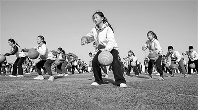 江蘇省海安市李堡鎮(zhèn)曹園小學的學生在大課間進行籃球運動。 周強 攝