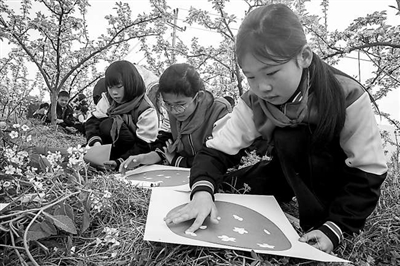 ②重慶市云陽縣蔈草鎮(zhèn)歧陽小學開展“識花·畫花·詠花”主題實踐課,圖為學生在梨園作畫。