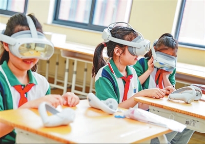 在上海市宋校嘉定實驗學??萍脊?jié)的“科普游園”活動中,學生正在參加“3D虛擬視界”項目。學校供圖