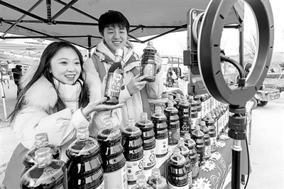 近日,在山東省淄博市周村區(qū)韓家窩村年貨大集上,山東輕工職業(yè)學(xué)院“數(shù)商興農(nóng)”直播團(tuán)隊(duì)的學(xué)生主播正在向網(wǎng)友推介當(dāng)?shù)靥禺a(chǎn)。據(jù)悉,該團(tuán)隊(duì)連續(xù)4年開展電商助農(nóng)實(shí)踐,累計(jì)進(jìn)行公益直播近300場(chǎng),幫助區(qū)域農(nóng)戶增收超百萬元。