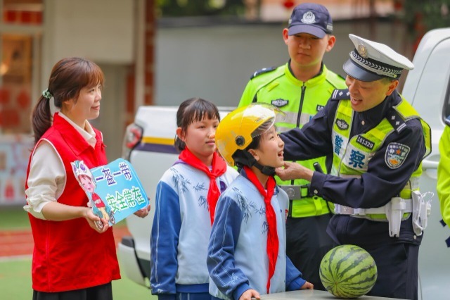 3月27日,在第30個(gè)全國(guó)中小學(xué)生安全教育日來(lái)臨之際,福建省福州市鼓樓區(qū)安泰街道五一廣場(chǎng)社區(qū)斗南小學(xué),一場(chǎng)“平安伴我成長(zhǎng) 交通安全宣教”主題教育活動(dòng)正在舉辦,鼓樓區(qū)交警大隊(duì)民警聯(lián)合社區(qū)志愿者,通過(guò)交通安全標(biāo)識(shí)辨認(rèn)、現(xiàn)場(chǎng)避險(xiǎn)體驗(yàn)、佩戴安全頭盔趣味游戲等形式,將“安全課堂”搬進(jìn)校園,向?qū)W生普及安全知識(shí),提升學(xué)生安全防范意識(shí)和自我保護(hù)能力。(中國(guó)教育報(bào)-中國(guó)教育新聞網(wǎng) 通訊員 謝貴明 攝)