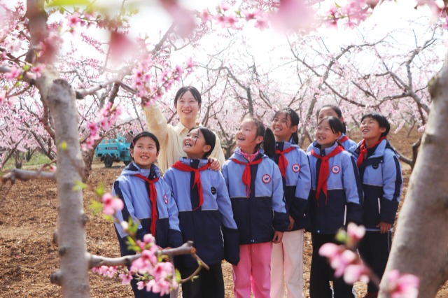 4月9日,山東省高密市東北鄉(xiāng)社區(qū)東流口子小學(xué)開展踏青研學(xué)活動(dòng),孩子們在老師的帶領(lǐng)下,來到校園周邊桃花園里,了解農(nóng)事、欣賞桃花、嬉戲玩耍,盡情感受大自然的魅力。中國教育報(bào)-中國教育新聞網(wǎng)通訊員 李海濤 攝