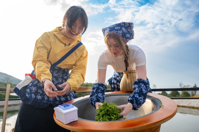 留學(xué)生在體驗(yàn)炒茶。通訊員 肖本祥 攝