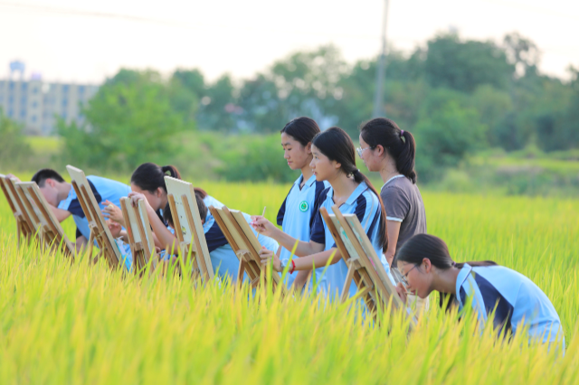 學(xué)生正在稻田寫(xiě)生,描繪秋日田園“豐”景,盡享戶外大課間的樂(lè)趣。通訊員 鄧和平 攝