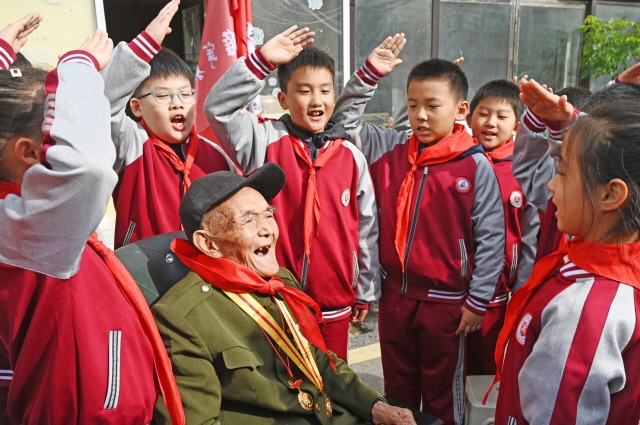 少先隊員向抗戰(zhàn)老兵馬鳳儉敬隊禮。通訊員 洪星 攝
