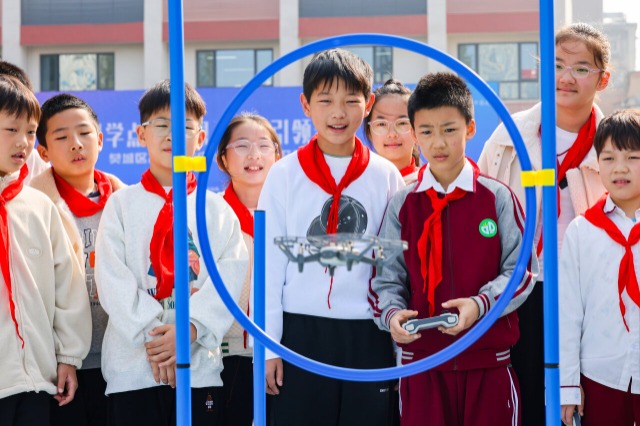 學(xué)生們正在體驗(yàn)穿越機(jī)過(guò)障礙項(xiàng)目。通訊員 付曉方 攝