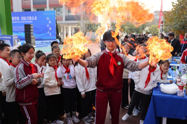 學(xué)生們正在進(jìn)行“火焰拳”的科學(xué)實(shí)驗(yàn)展示。通訊員 付曉方 攝
