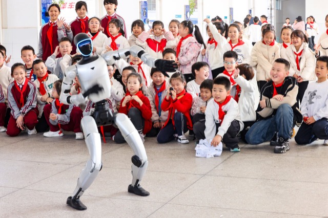 學(xué)生們?cè)谟^看機(jī)器人跳舞。通訊員 付曉方 攝