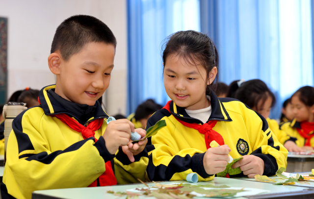 深秋時節(jié),山東省棗莊市市中區(qū)東湖小學(xué)開展“小手巧作樹葉畫”活動,學(xué)生們巧妙利用各種造型的落葉,通過用剪、拼、粘等方法制作成“樹葉畫”,留住多彩秋天,表達(dá)對大自然的熱愛。中國教育報-中國教育新聞網(wǎng)通訊員 孫中喆 楊列元 攝