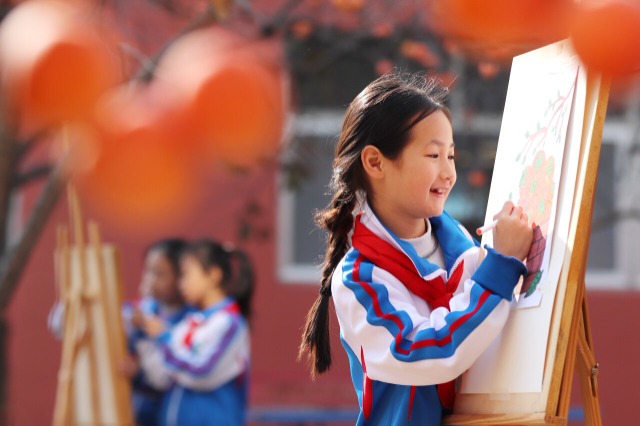 小學(xué)生在柿子林里畫畫 李海濤 攝