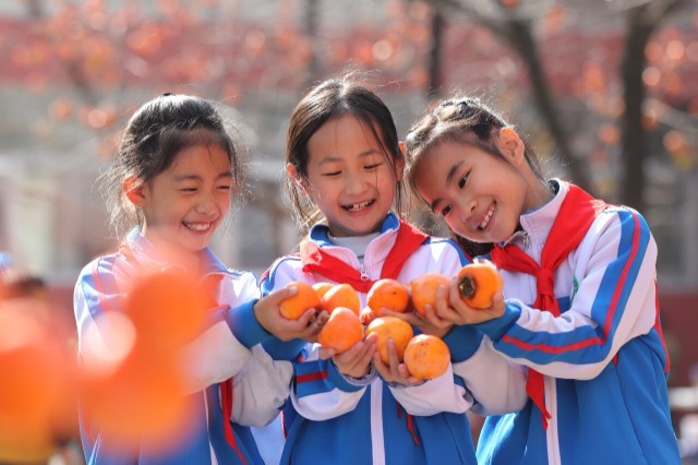 小學(xué)生在展示自己采摘的柿子 李海濤 攝
