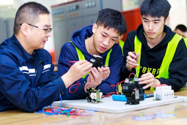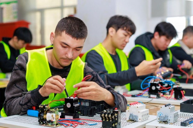 大學(xué)生們正在進(jìn)行電工作業(yè)實(shí)操。通訊員 孫振嵩 攝