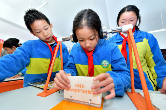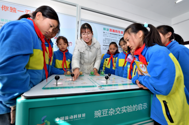 教師指導(dǎo)學(xué)生體驗(yàn)科技展品。通訊員 楊韜 來(lái)長(zhǎng)發(fā) 攝