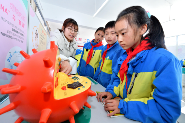 教師指導(dǎo)學(xué)生觀看細(xì)胞模型。通訊員 楊韜 來(lái)長(zhǎng)發(fā) 攝