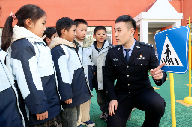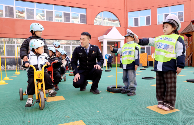 11月26日,江蘇省宿遷市公安局宿城分局府苑派出所民警向小朋友宣傳交通安全知識。民警以通俗易懂的語言講解交通安全知識,用游戲、問答等互動(dòng)方式引導(dǎo)小朋友要遵守交通規(guī)則,增強(qiáng)交通安全意識,養(yǎng)成良好的文明交通安全習(xí)慣。中國教育報(bào)-中國教育新聞網(wǎng)通訊員 王力 攝