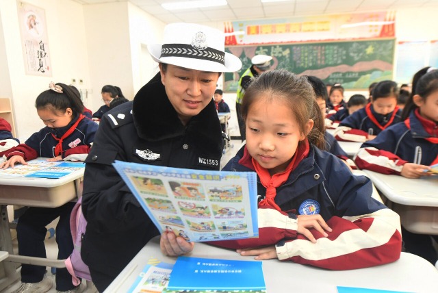 11月28日,在河北省石家莊新樂市新華路小學(xué),民警向小學(xué)生普及交通標(biāo)識知識。12月2日“全國交通安全日”到來之際,各地的中小學(xué)、幼兒園開展交通安全宣傳教育活動,讓孩子們了解相關(guān)知識,增強(qiáng)交通安全意識。中國教育報-中國教育新聞網(wǎng)通訊員 賈敏杰 攝